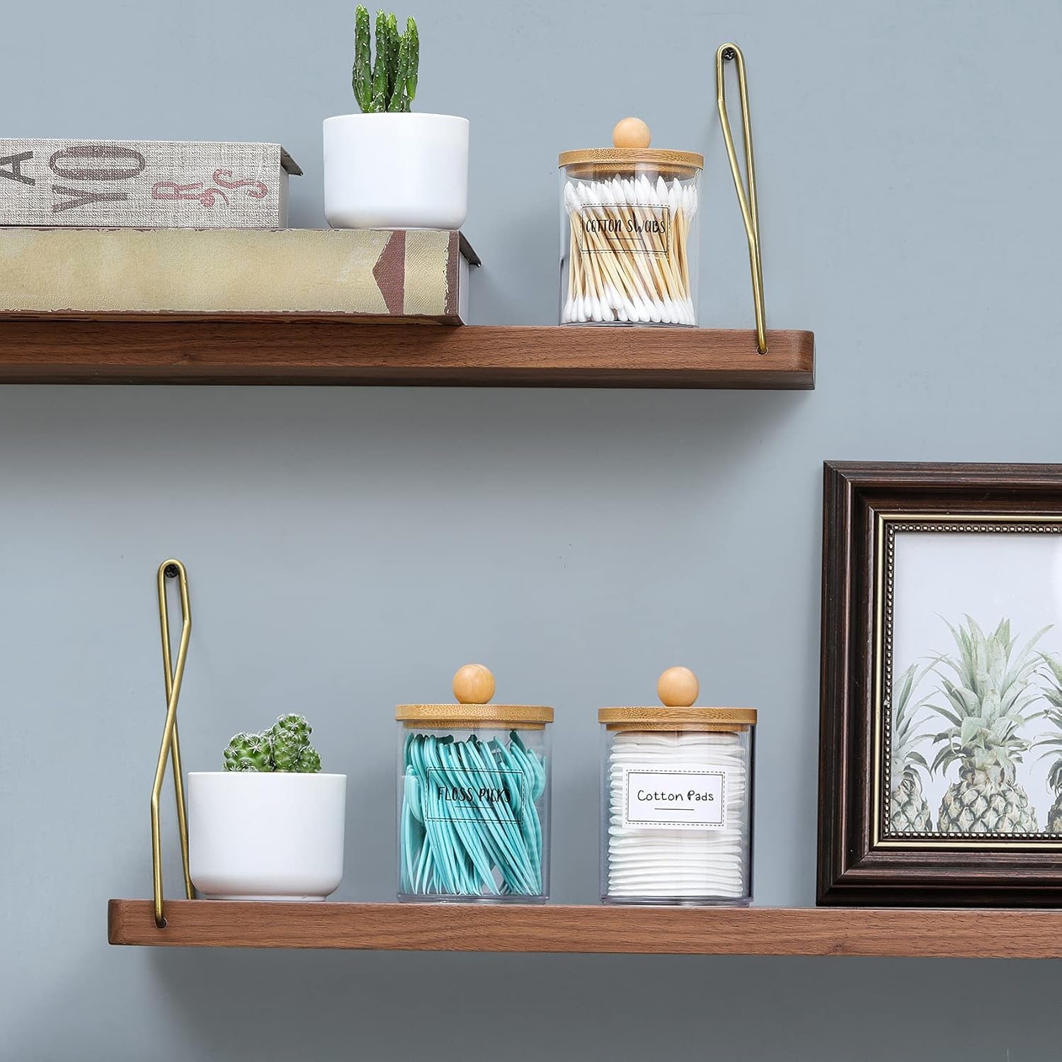 4 Pack Qtip Holder Dispenser with Bamboo Lids – 10 oz Clear Plastic Apothecary Jar Containers for Vanity Makeup Organizer Storage – Bathroom Accessories Set for Cotton Swab, Ball, Pads, Floss