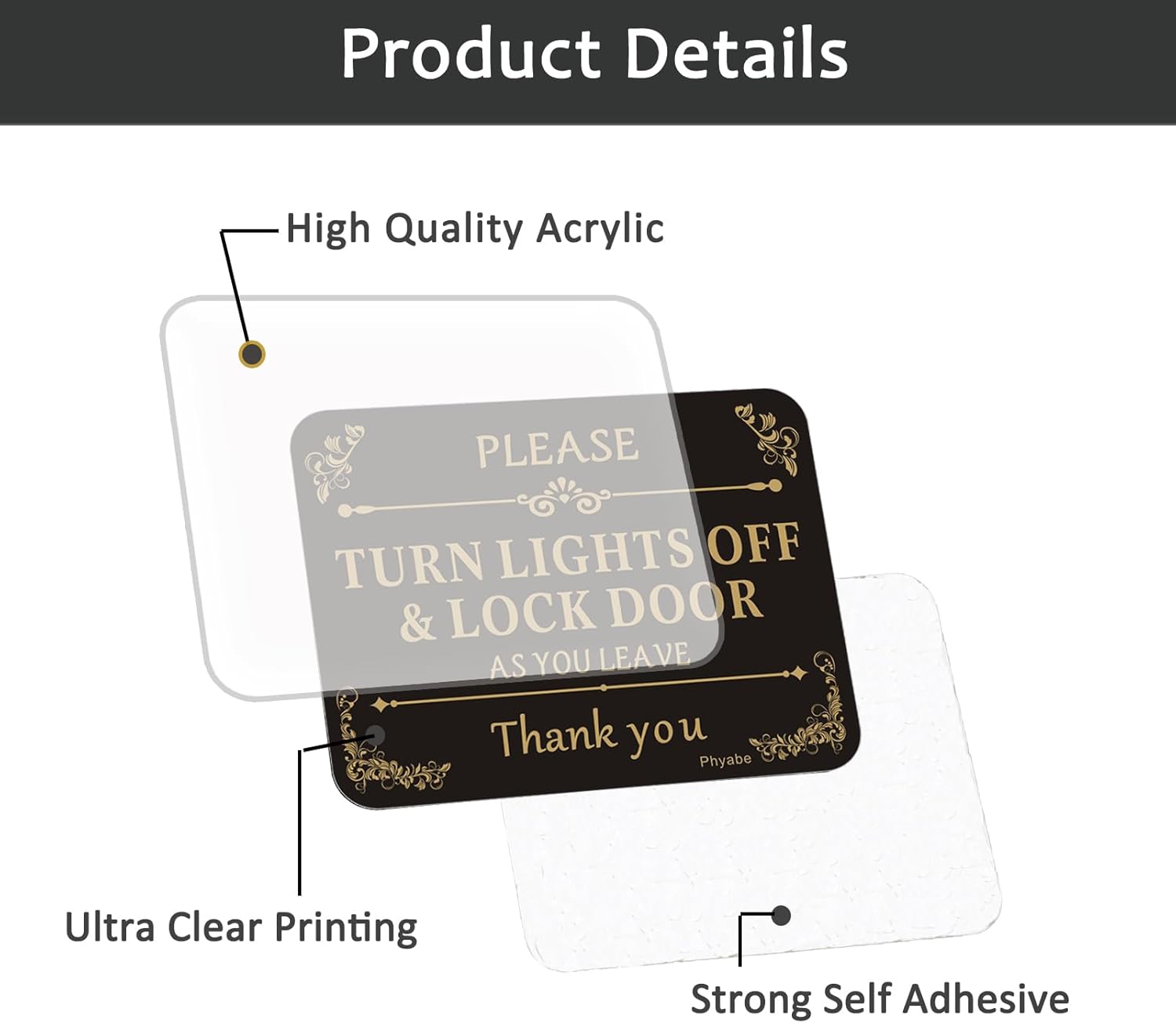 4 PCS Turn Lights off & Lock Door Sign, 5” x 4” Thick Acrylic Self-Adhesive Sign, Ideal for Restaurants, Bars, Hotels, and Airbnb, Easy to Install