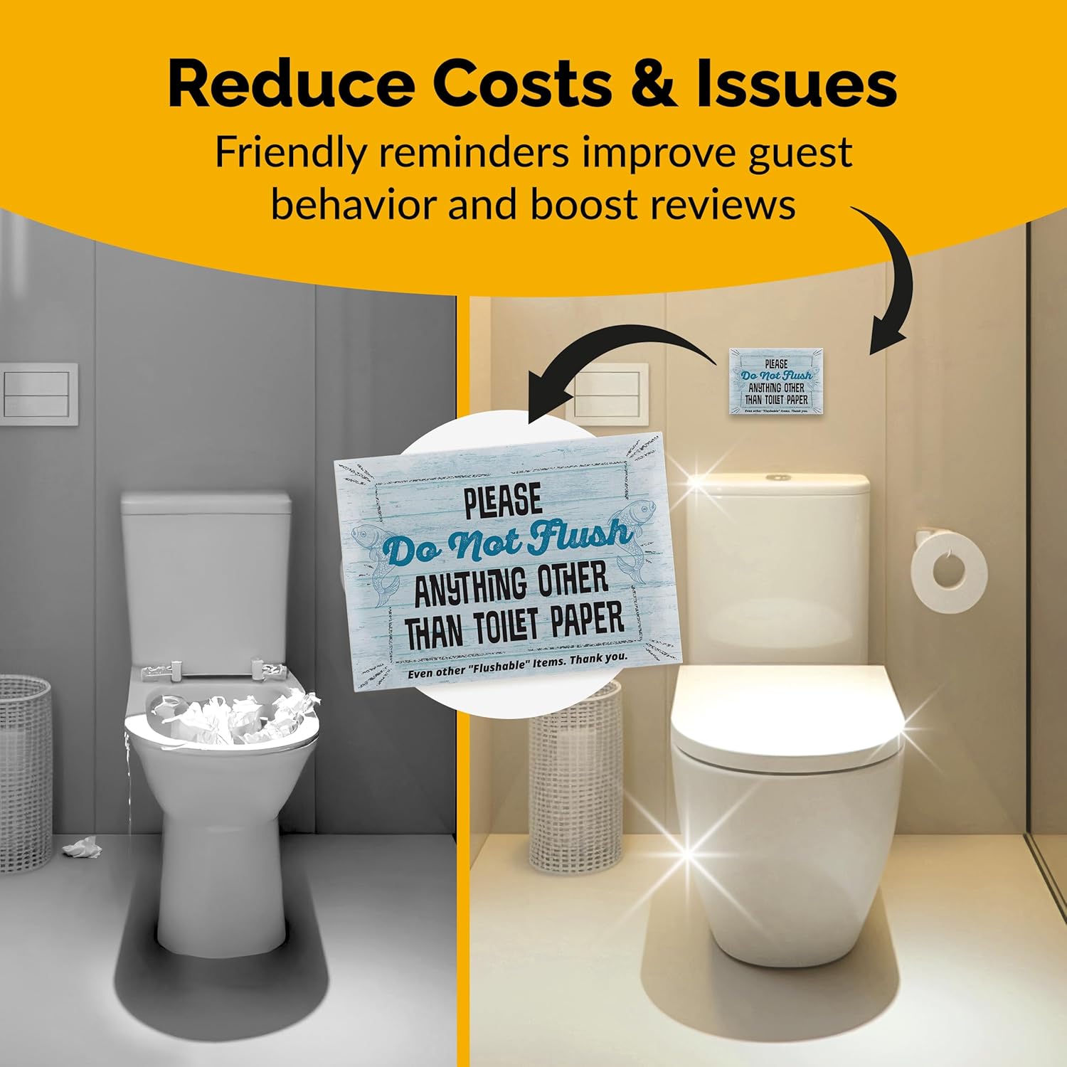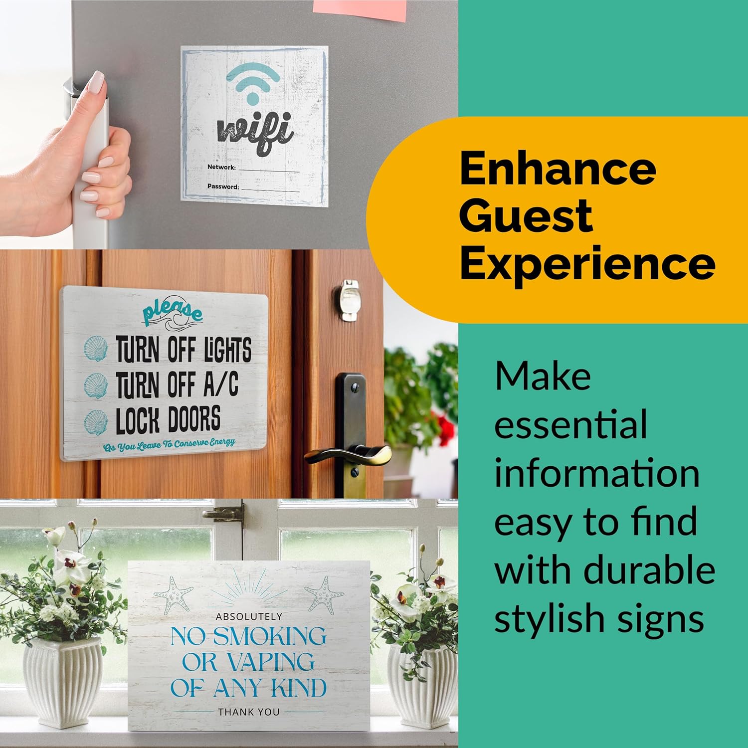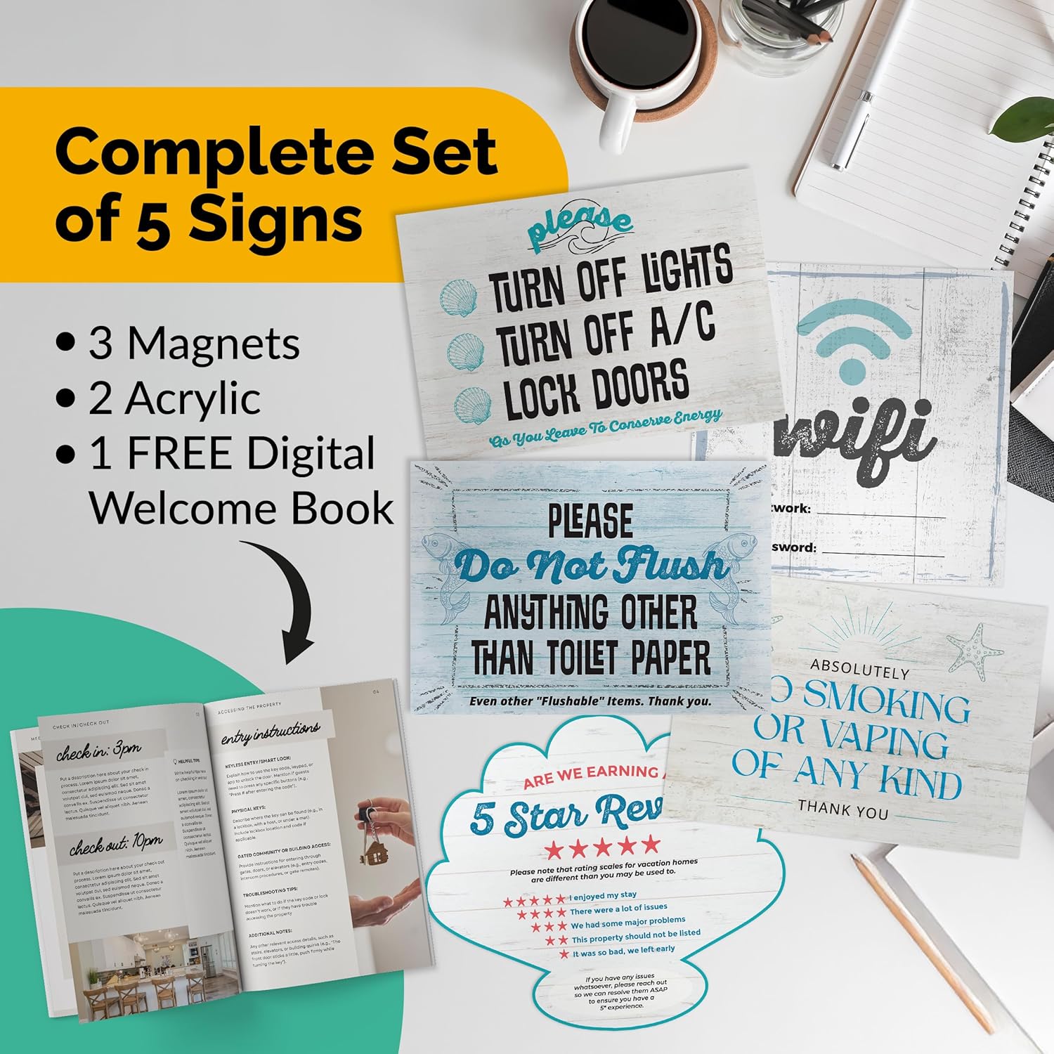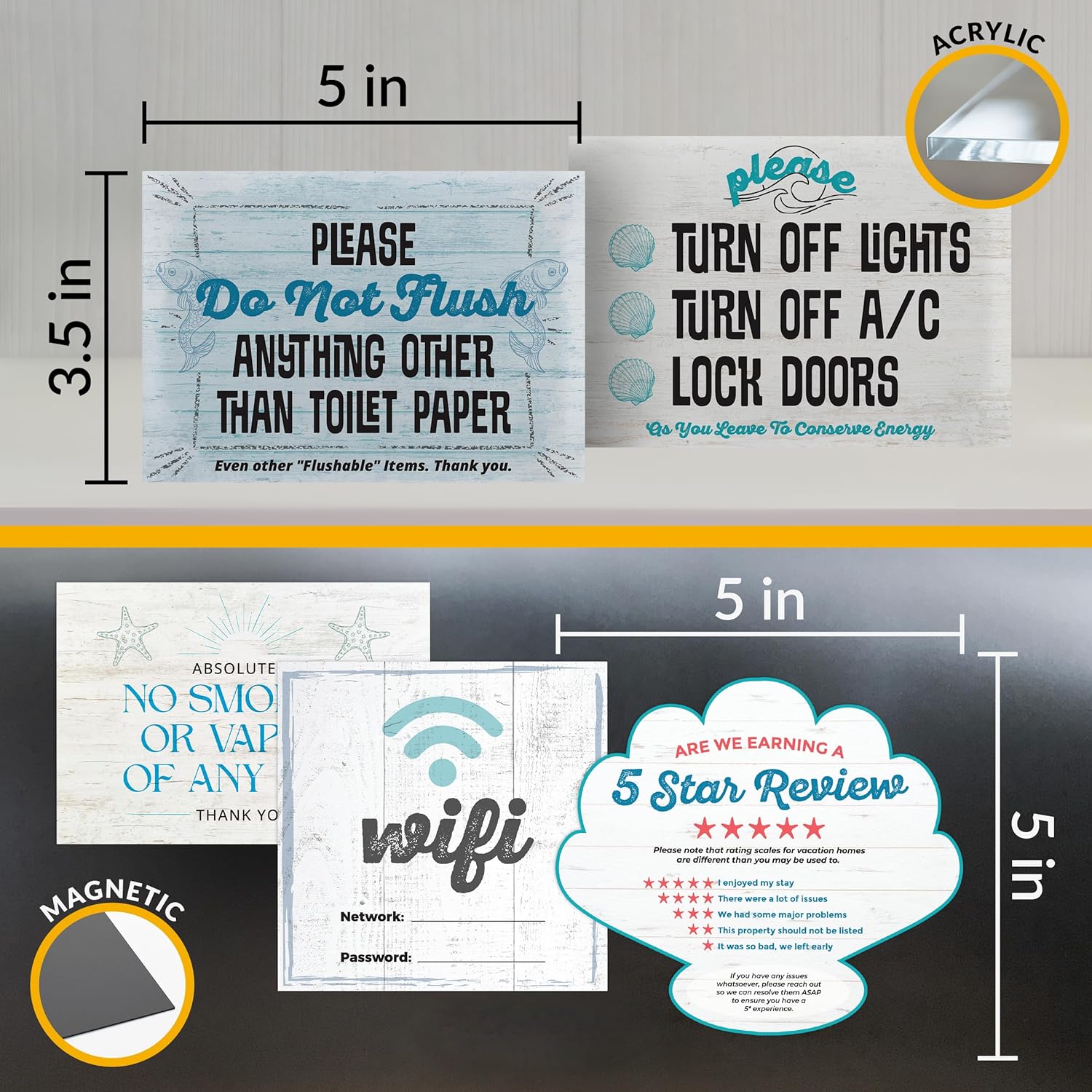 5 Essential AirBnB Signs For Hosts | Wifi Password Sign For Home Guests, No Smoking, Do Not Flush For Bathroom Toilet, Turn Off Lights & AC, Air Bnb Vacation Rental Review Request Fridge Magnet