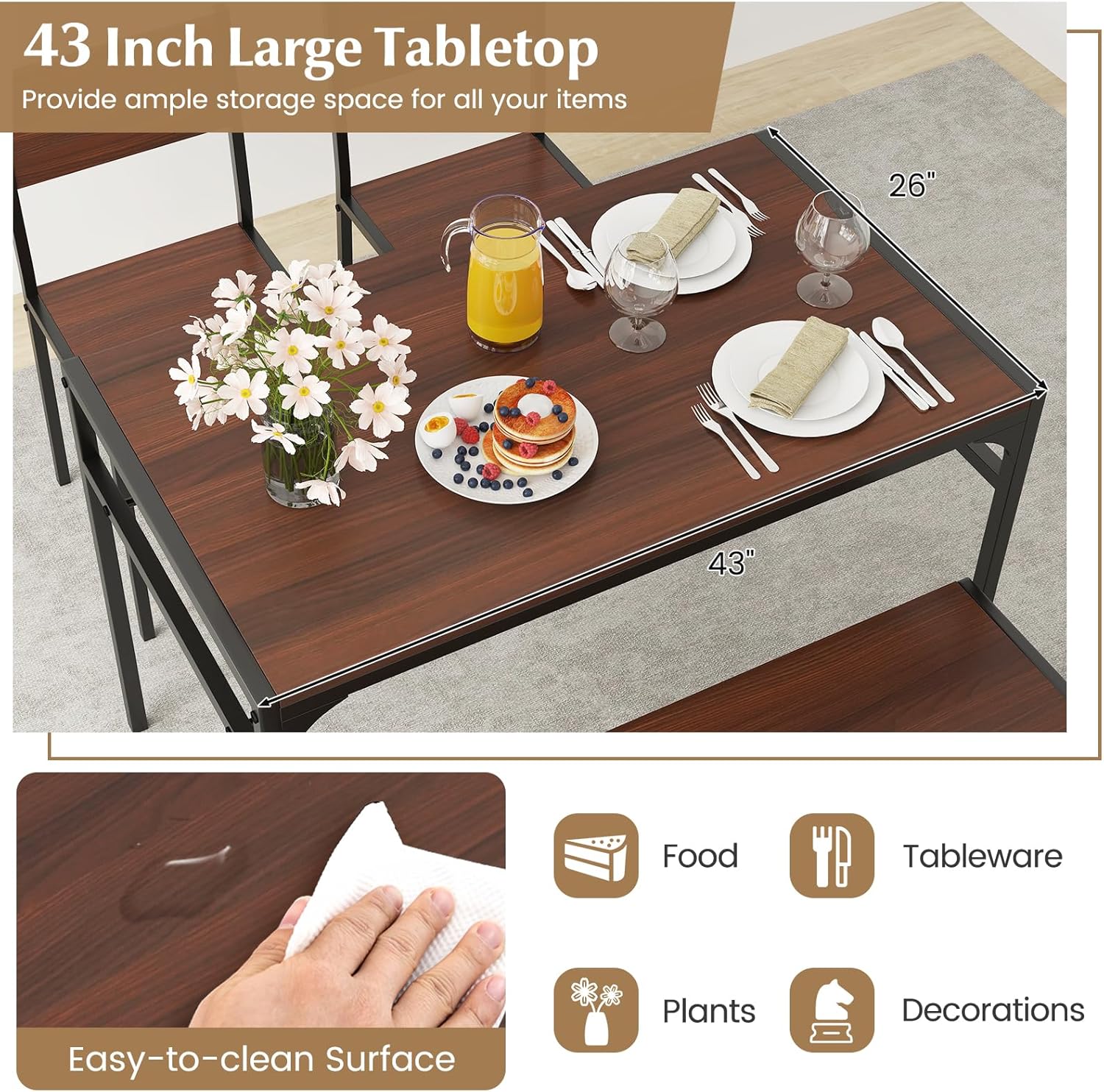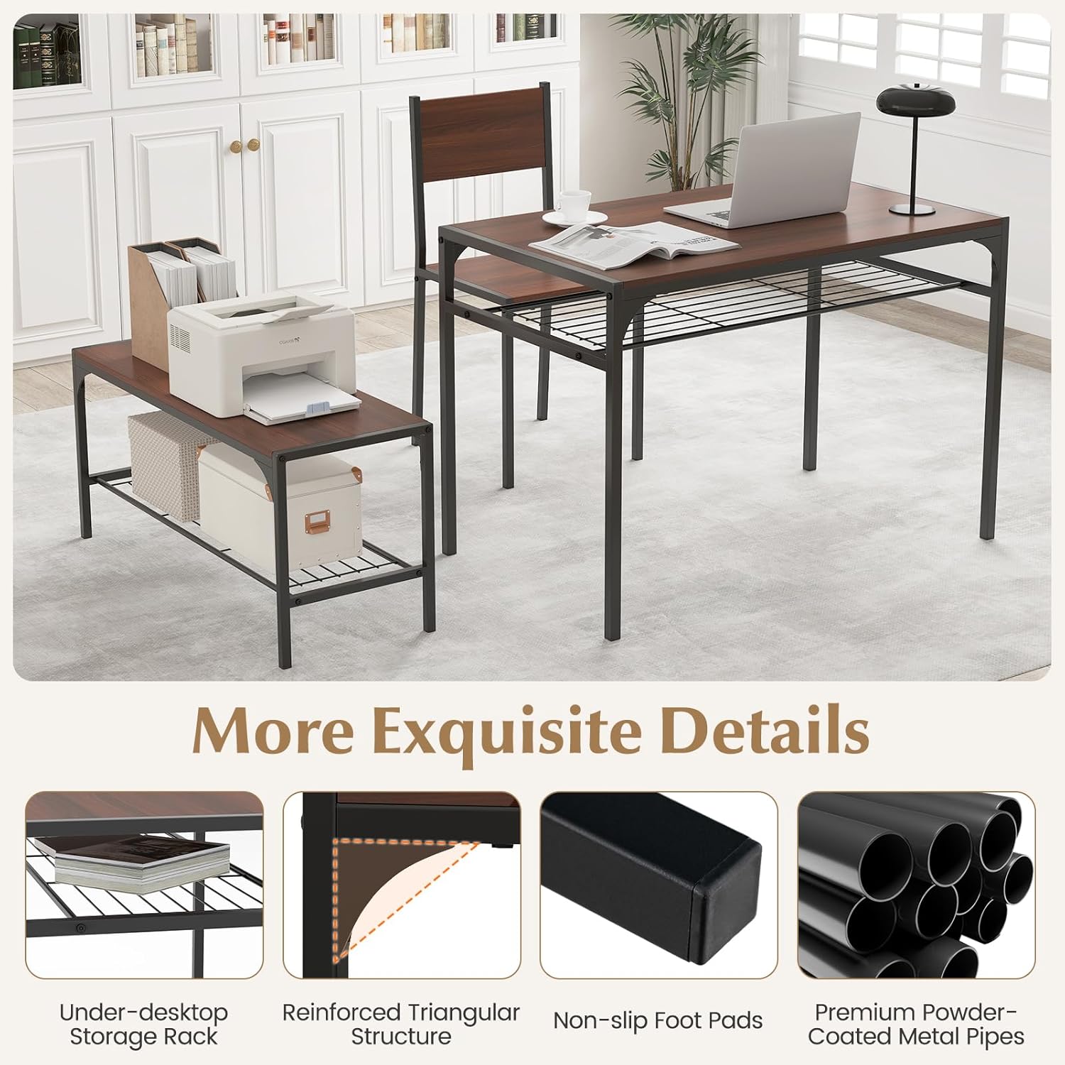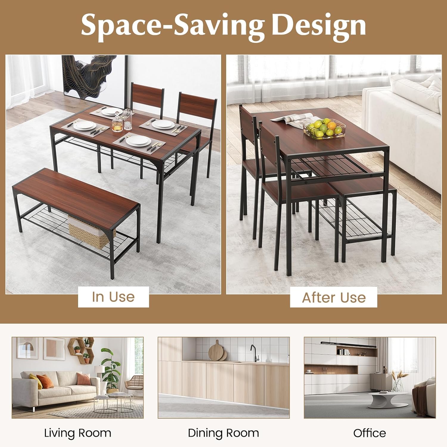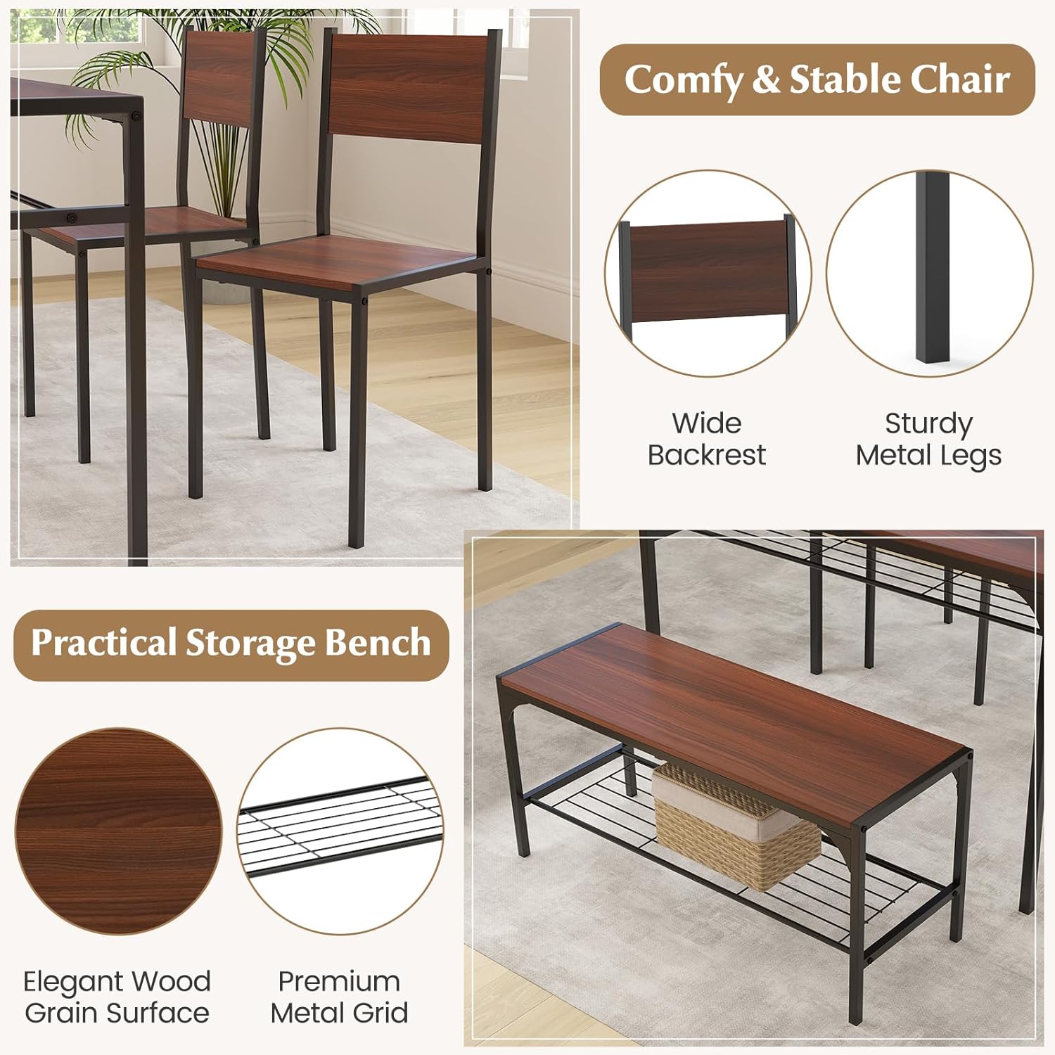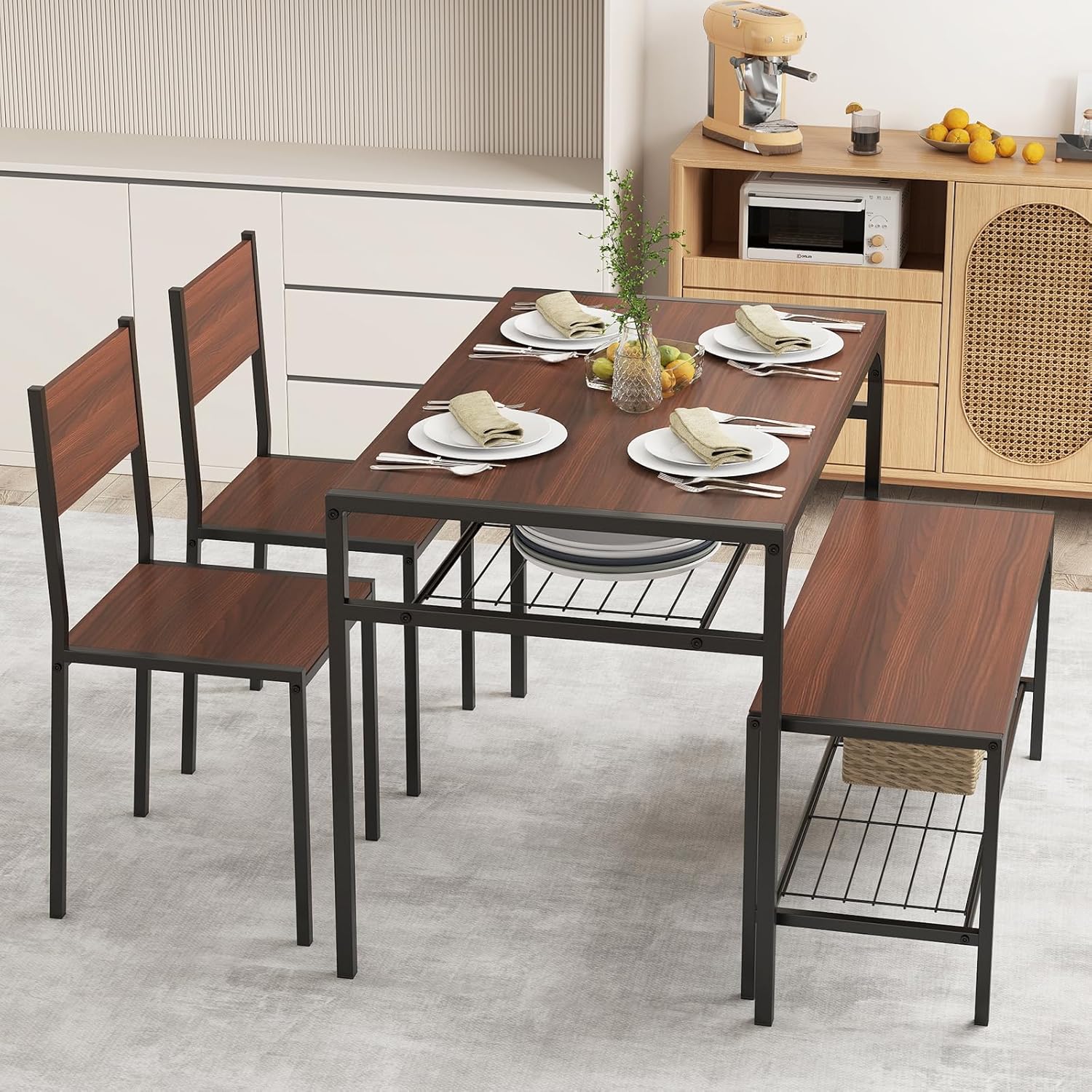 COSTWAY 4 Pieces Dining Table Set, Kitchen Table and 2 Chairs for 4 with Bench, Storage Racks, Metal Frame & Space-Saving Design, Industrial Kitchen Table Set for Small Space, Apartment (Walnut)
