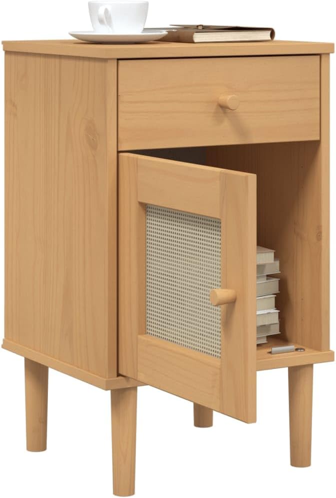 Mid-Century Brown Pine Wood Nightstand with Rattan Look Door, 13.8 x 15.7 x 25.6 in Small Bedside Table for Bedroom, Tall Side Table with Drawer & Shelf for Living Room