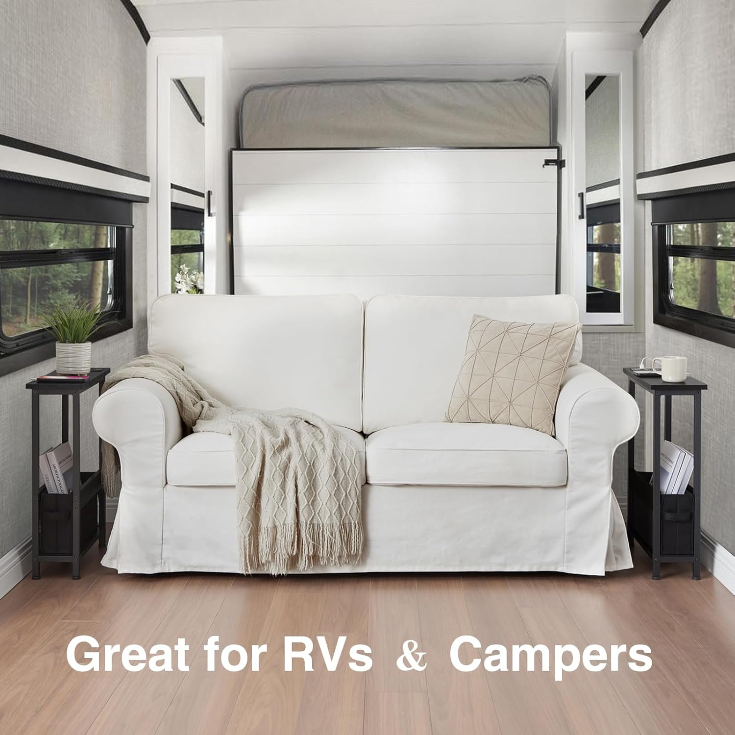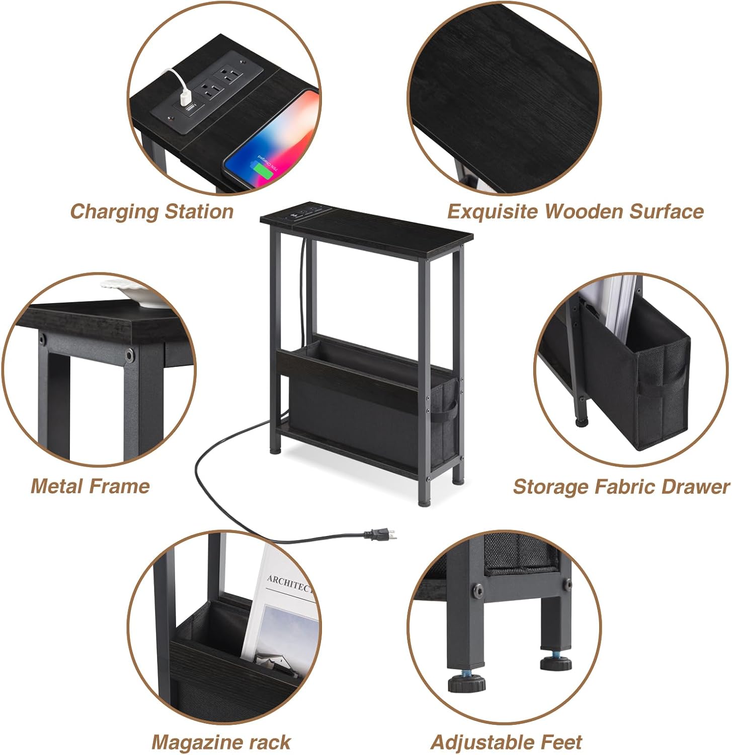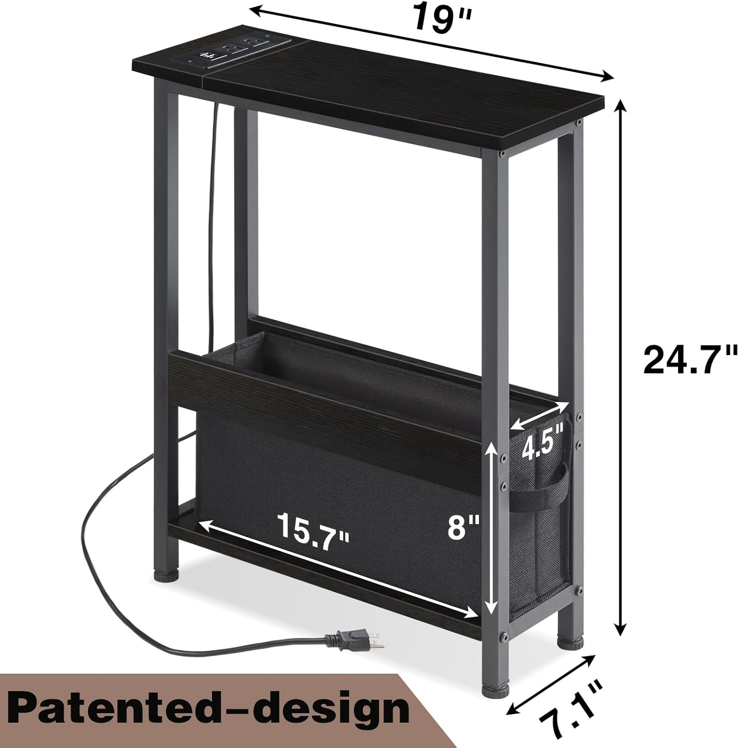 Slim Charging End Table with Storage – for Small Spaces and Bedroom (Black)