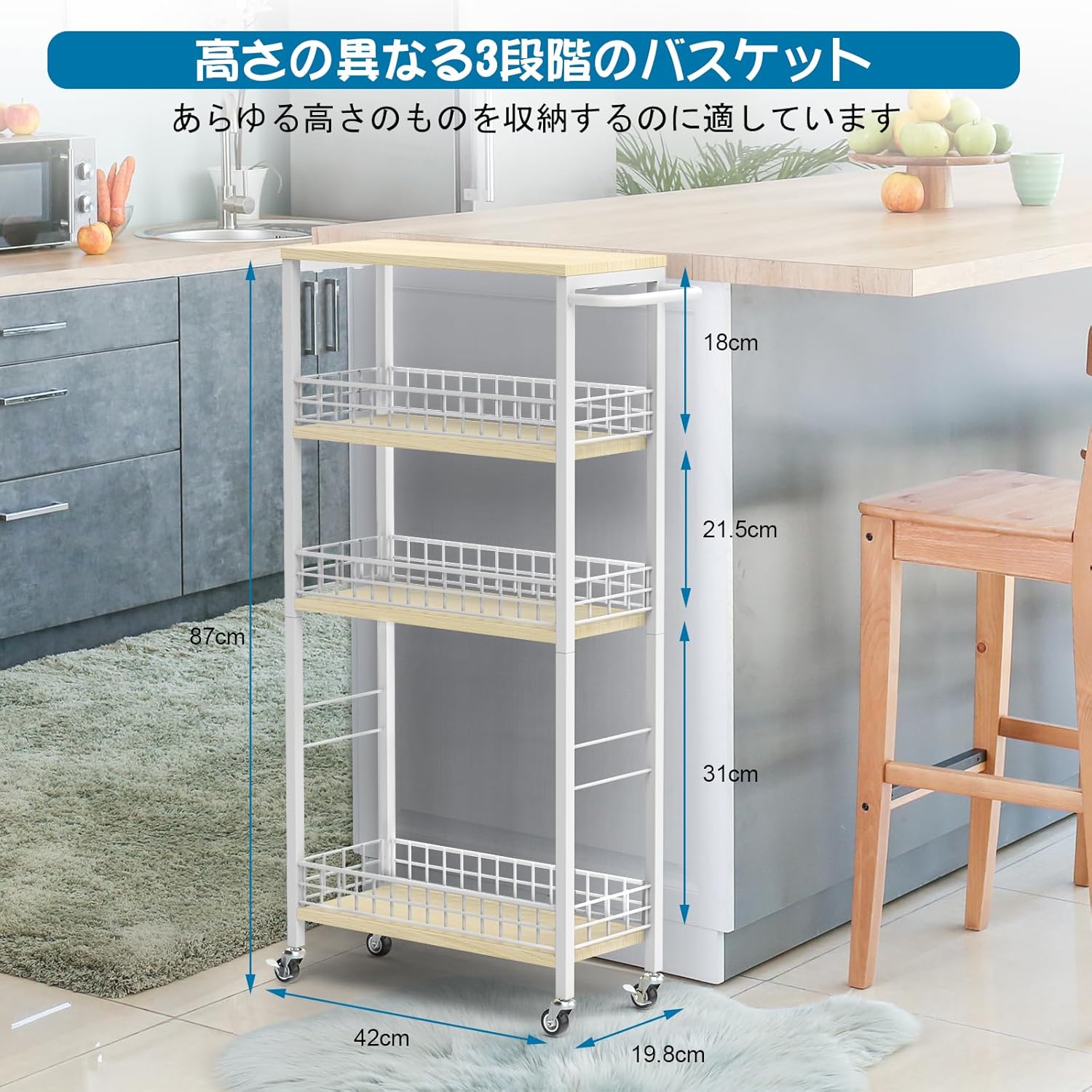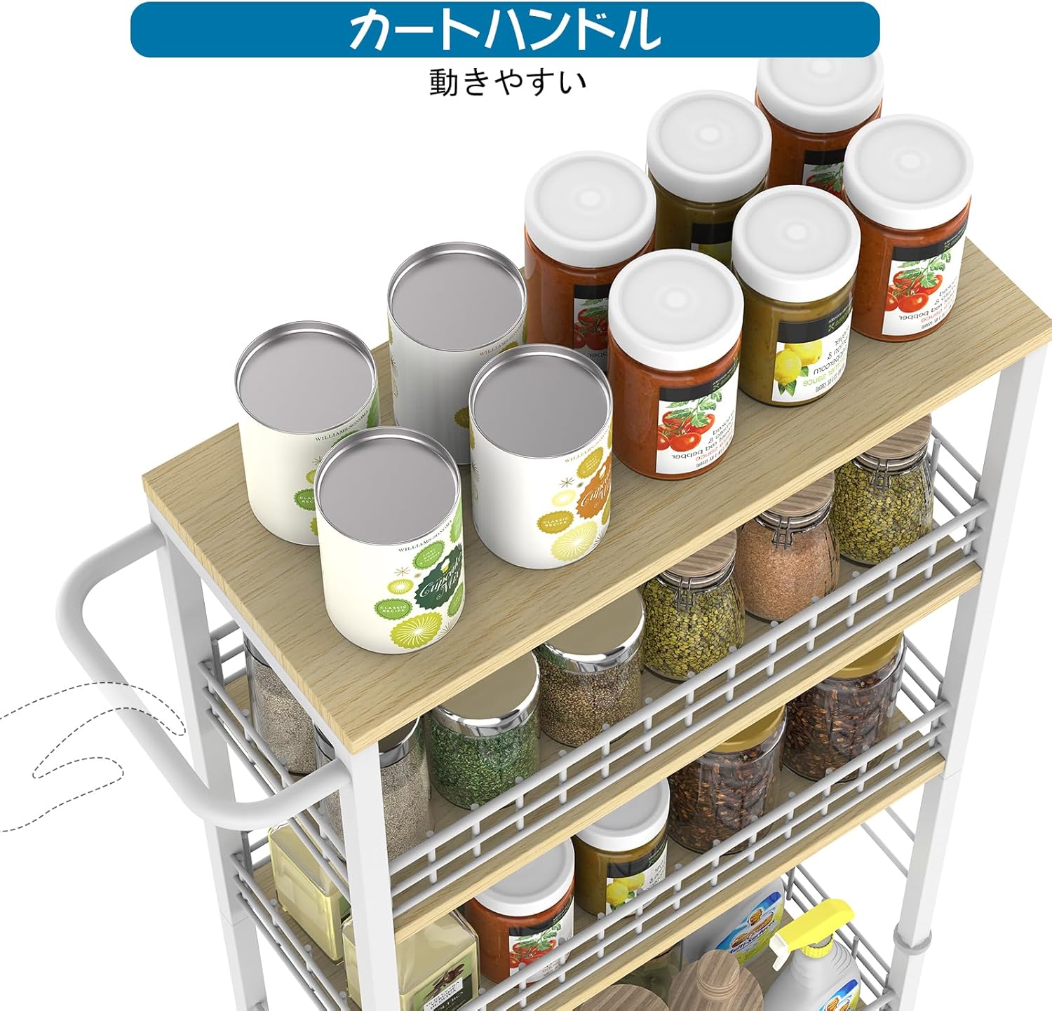 YBING Slim Storage Cart 4-Tier Rolling Kitchen Utility Cart White Narrow Laundry Storage Cart on Wheels and Wood Table Top Mobile Shelving Unit Organizer Trolley for Bathroom Small Space 7.3″ W